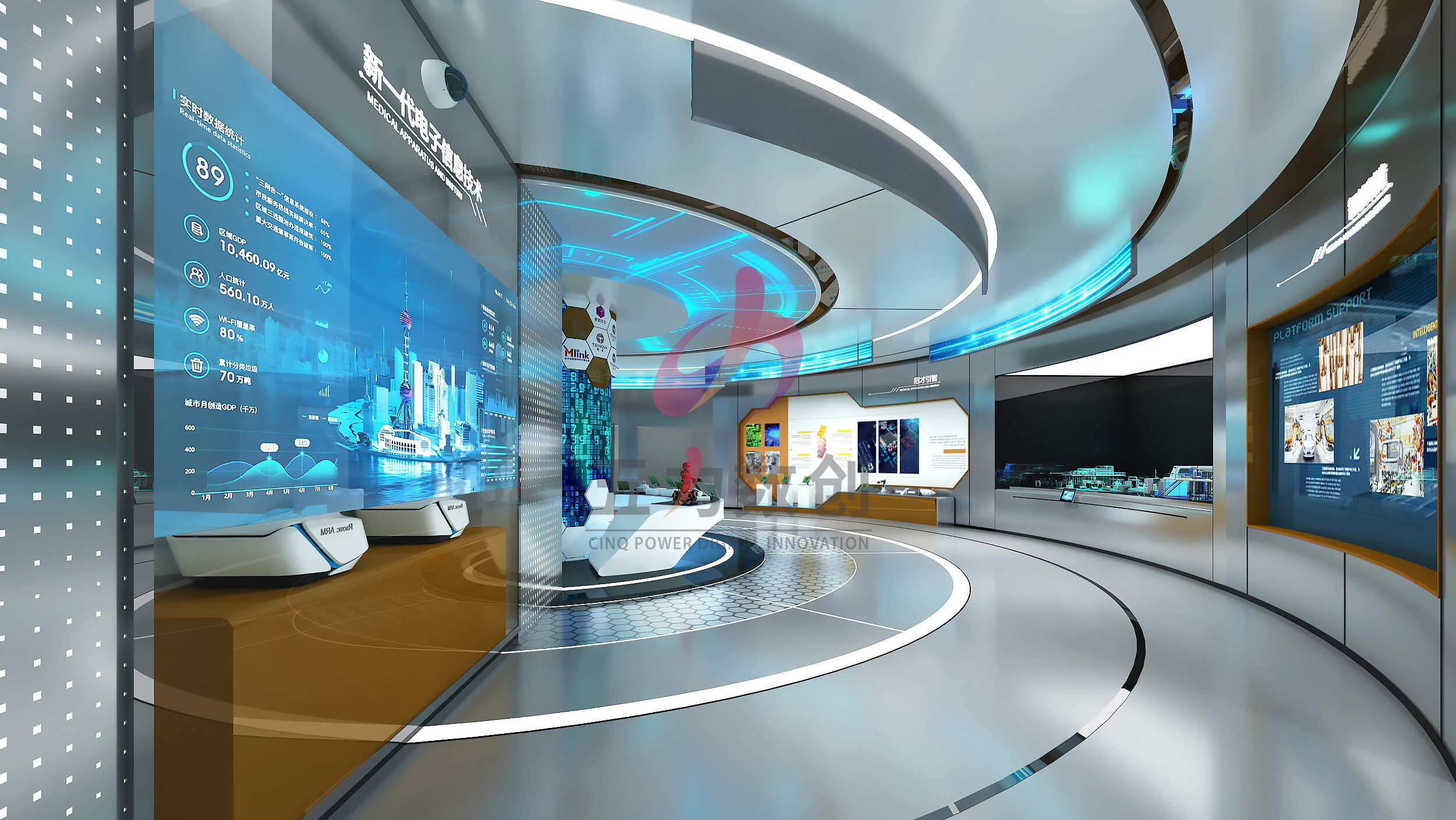 中電光谷科技城展示中心占地面積約為895㎡,共劃分為序廳,戰(zhàn)略篇、平臺篇、產業(yè)篇、未來篇五大展區(qū)。展廳設計以藍色和灰色為主色調,營造濃厚的工業(yè)風格;提取重慶山城設計元素和科技線條營造充滿現(xiàn)代感,科技感,未來感又獨具本地特色的展示空間。同時以數(shù)字沙盤、多媒體互動裝置、弧幕影院等多種數(shù)字多媒體展項布局,呈現(xiàn)沉浸場景,智能體驗,全方位展現(xiàn)園區(qū)項目和服務,整體規(guī)劃和產業(yè)集聚以及優(yōu)勢成果,生動彰顯中電光谷在行業(yè)里的智造地位和強大實力,體現(xiàn)中電光谷的園區(qū)價值和孵化能力,助力招商引資。